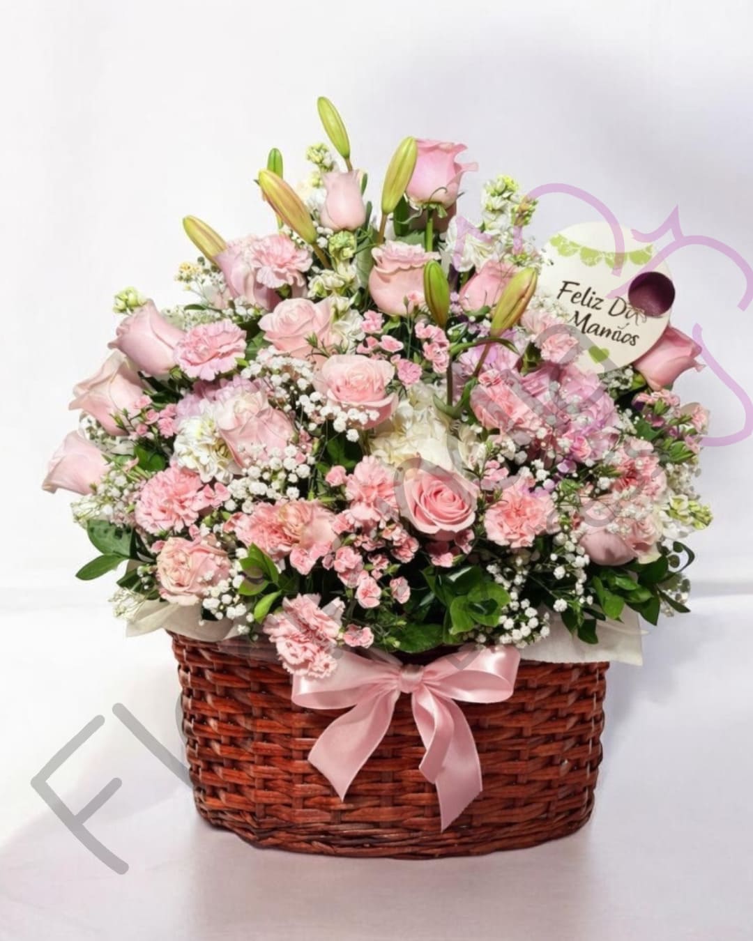 Hermosa canasta floral con rosas rosadas, claveles y flores frescas, diseñada especialmente para el Día de la Madre. Un arreglo elegante y delicado, ideal para sorprender a mamá y expresar amor, ternura y gratitud en su día especial.