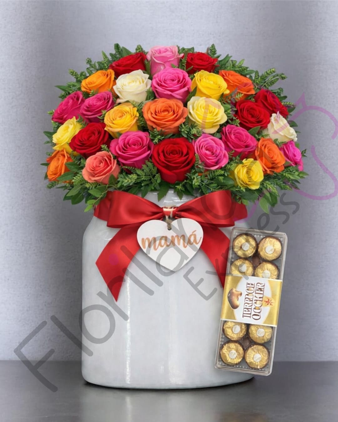 Encantador arreglo de rosas de colores en elegante base decorativa, acompañado de finos chocolates. Un regalo vibrante y lleno de vida, perfecto para el Día de la Madre, cumpleaños o cualquier ocasión especial para sorprender a mamá con amor y alegría.