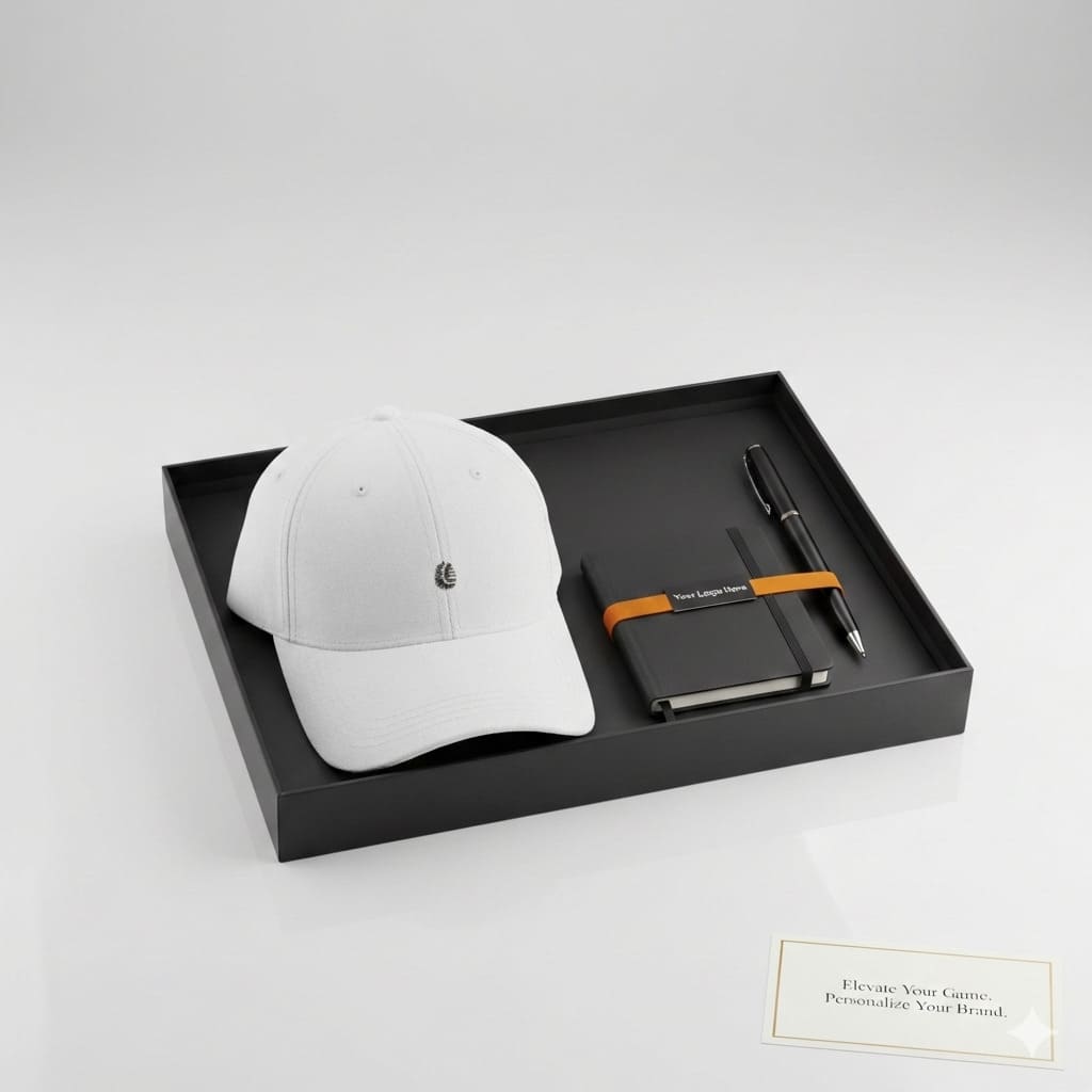 Gorra corporativa, libreta ejecutiva y bolígrafo. Diseñado para eventos, equipos de trabajo o actividades de posicionamiento de marca.