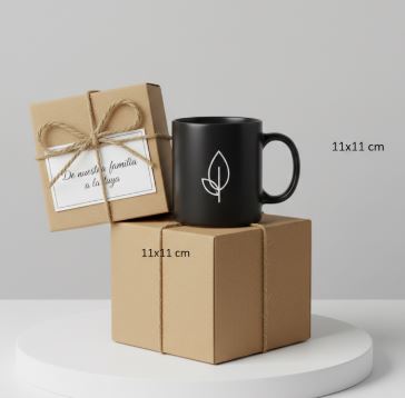 Pocillo Mugs con logo. Empaque en caja de cartón xcms. Moño y tarjeta.